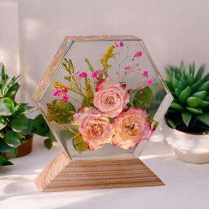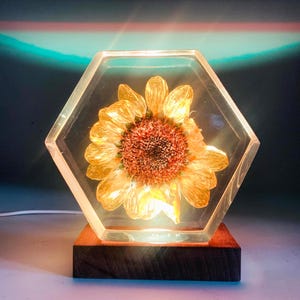 Hexagon Resin Flower Lamp: Sunflower & Rose Night Light, Personalized Wood Base