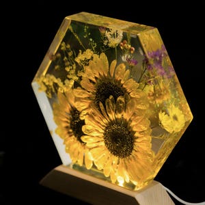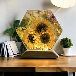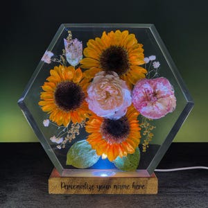 Resin Flower Lamp with Sunflowers & Peonies | Personalized Hexagon Epoxy Light Gift for Her