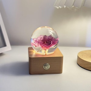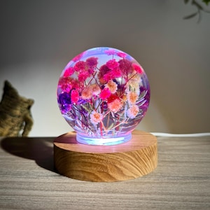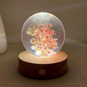 Flower Resin Globe Lamp – LED Night Light with Real Dried Flowers on Wooden Base, Personalized Gift for Her